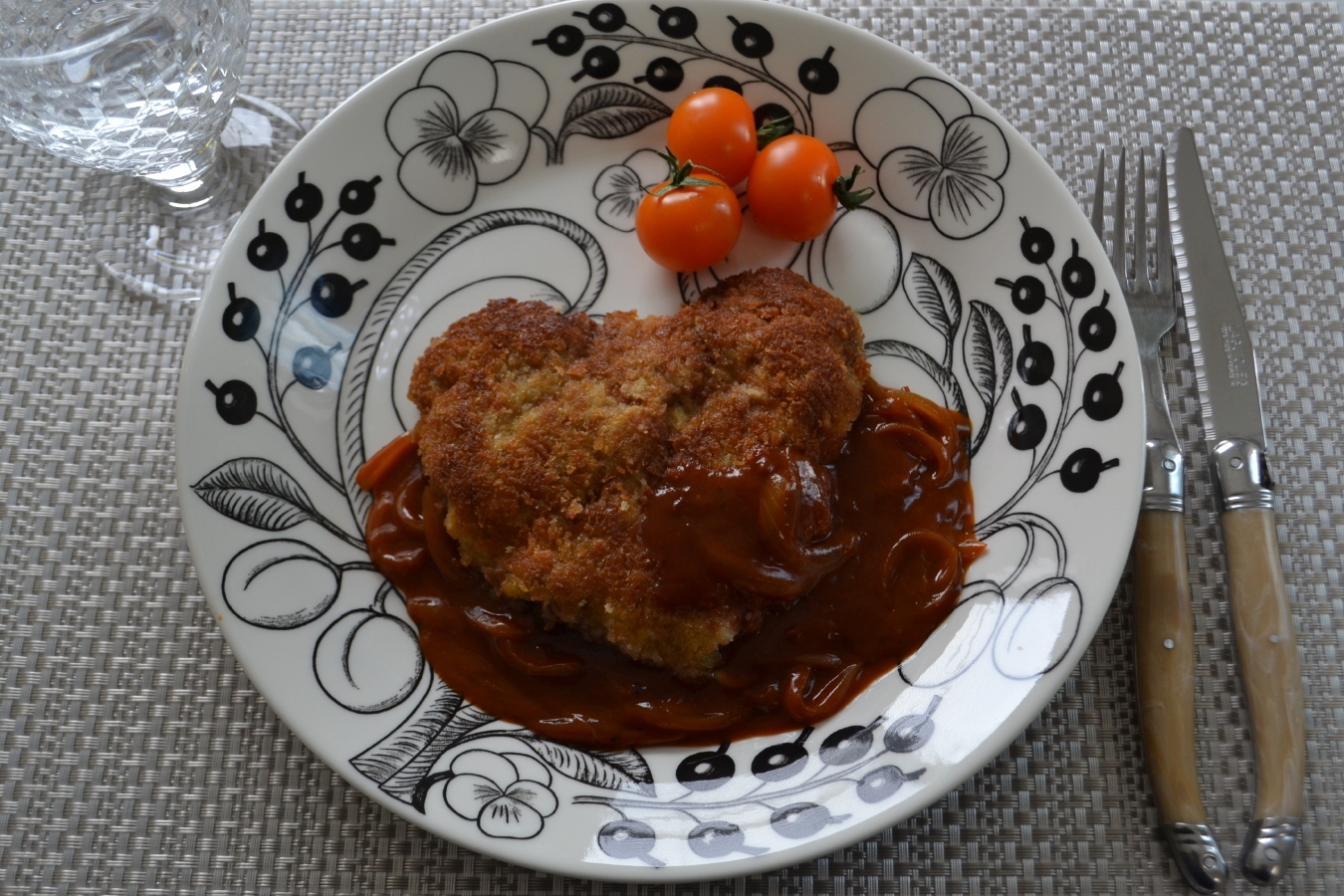 仔牛のほほ肉を叩いて伸ばし、ハート型にしてカツレツにしました?ソースはハヤシでカツレツに良く合います☆